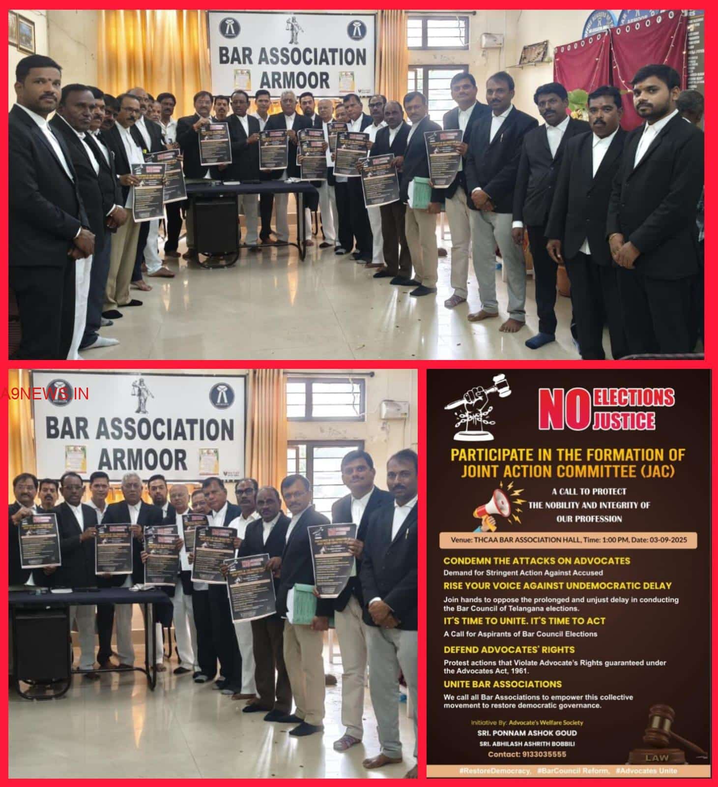 A9 న్యూస్ ప్రతినిధి ఆర్మూర్: ఆర్మూర్ బార్ అసోసియేషన్ ఆధ్వర్యంలో బార్ కౌన్సిల్ ఆఫ్ తెలంగాణ జేఏసీ పిలుపు మేరకు బుధవారం బార్ అసోసియేషన్ హాల్‌లో గోడ ప్రతులు (వాల్ పోస్టర్లు) విడుదల....