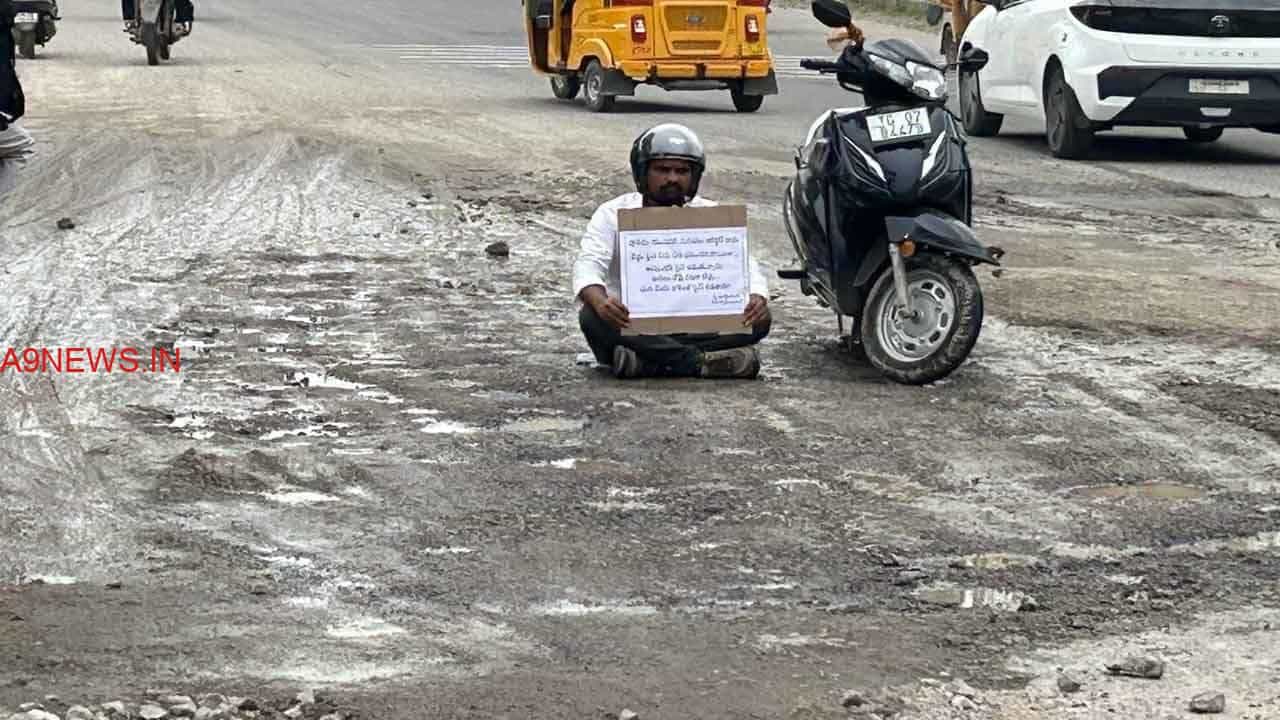 ఫైన్లు కాదు… రోడ్లు సరి చేయండి!’ గుంతలో కూర్చొని యువకుడి వినూత్న నిరసన”….