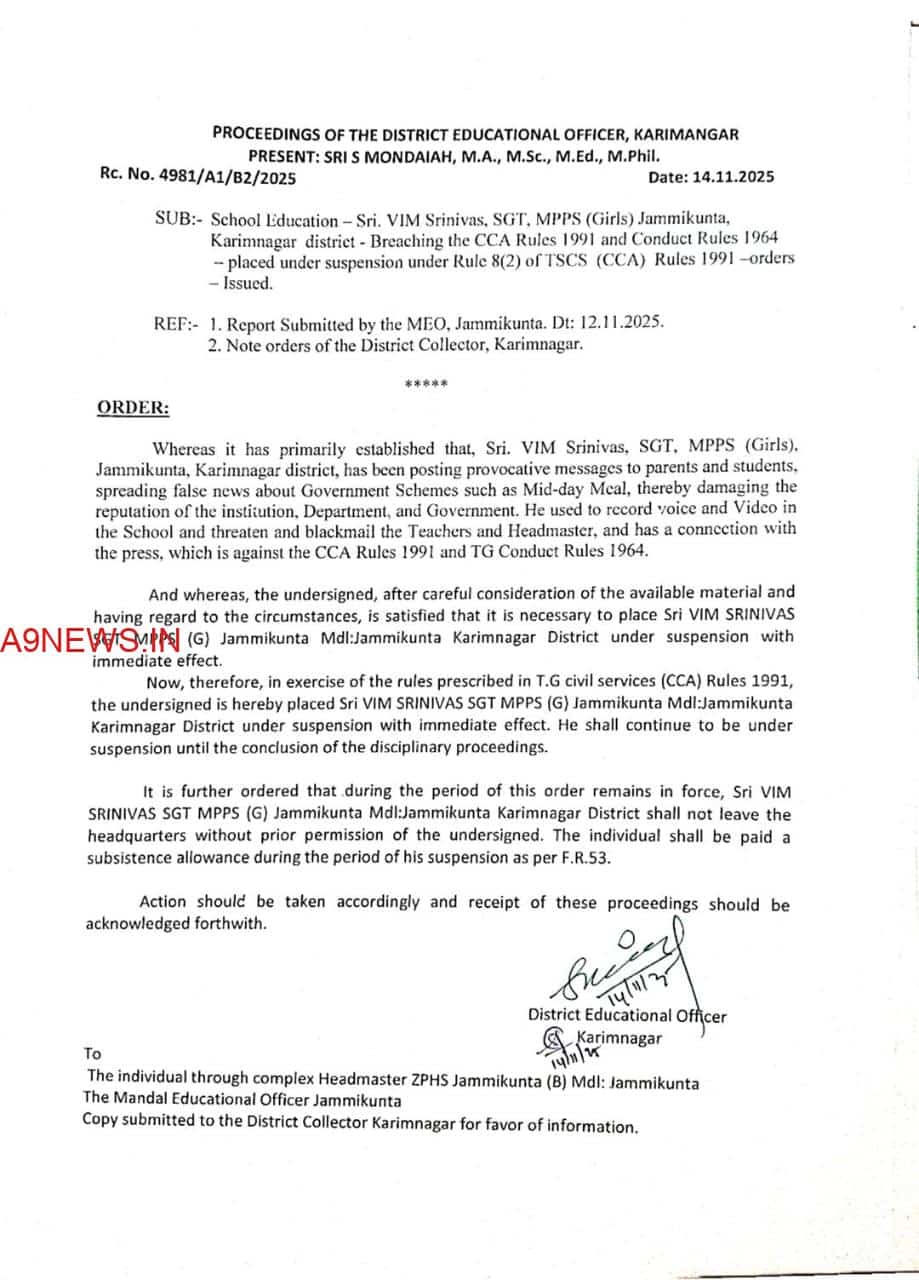 కరీంనగర్ జిల్లాలో జమ్మికుంట మండలం ఘటన… కరీంనగర్ జిల్లా జమ్మికుంట మండలంలోని MPPS (గర్ల్స్) పాఠశాలలో SGTగా పనిచేస్తున్న ప్రభుత్వ ఉపాధ్యాయుడు శ్రీనివాస్ను డీఈఓ సస్పెండ్ చేశారు. తెలంగాణ ప్రభుత్వంపై విమర్శాత్మక వ్యాఖ్యలు....
