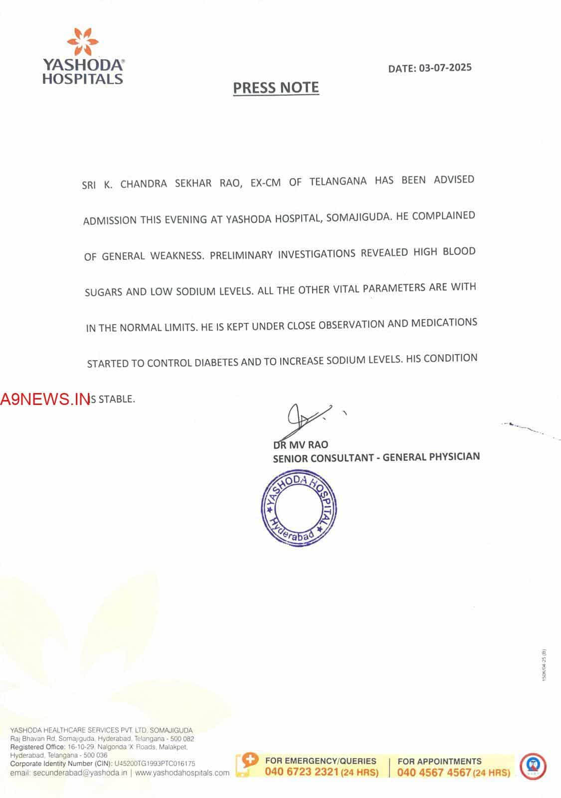 కేసీఆర్ హెల్త్ బులెటిన్ విడుదల చేసిన యశోద ఆసుపత్రి యాజమాన్యం: