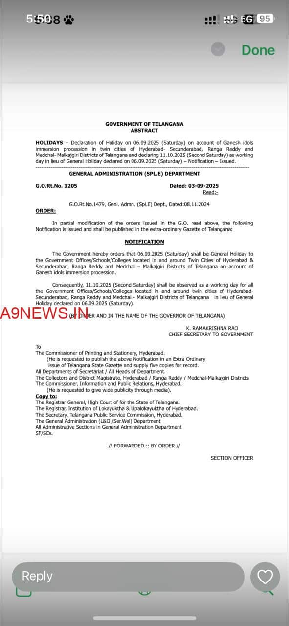 వినాయక నిమర్జనం సందర్భంగా తెలంగాణ ప్రభుత్వం 6వ తేదీ (శనివారం) రోజు సెలవు ప్రకటించింది. ఈ సెలవు హైదరాబాద్, సికింద్రాబాద్, రంగారెడ్డి, మేడ్చల్–మల్కాజ్గిరి జిల్లాల్లో వర్తిస్తుంది.